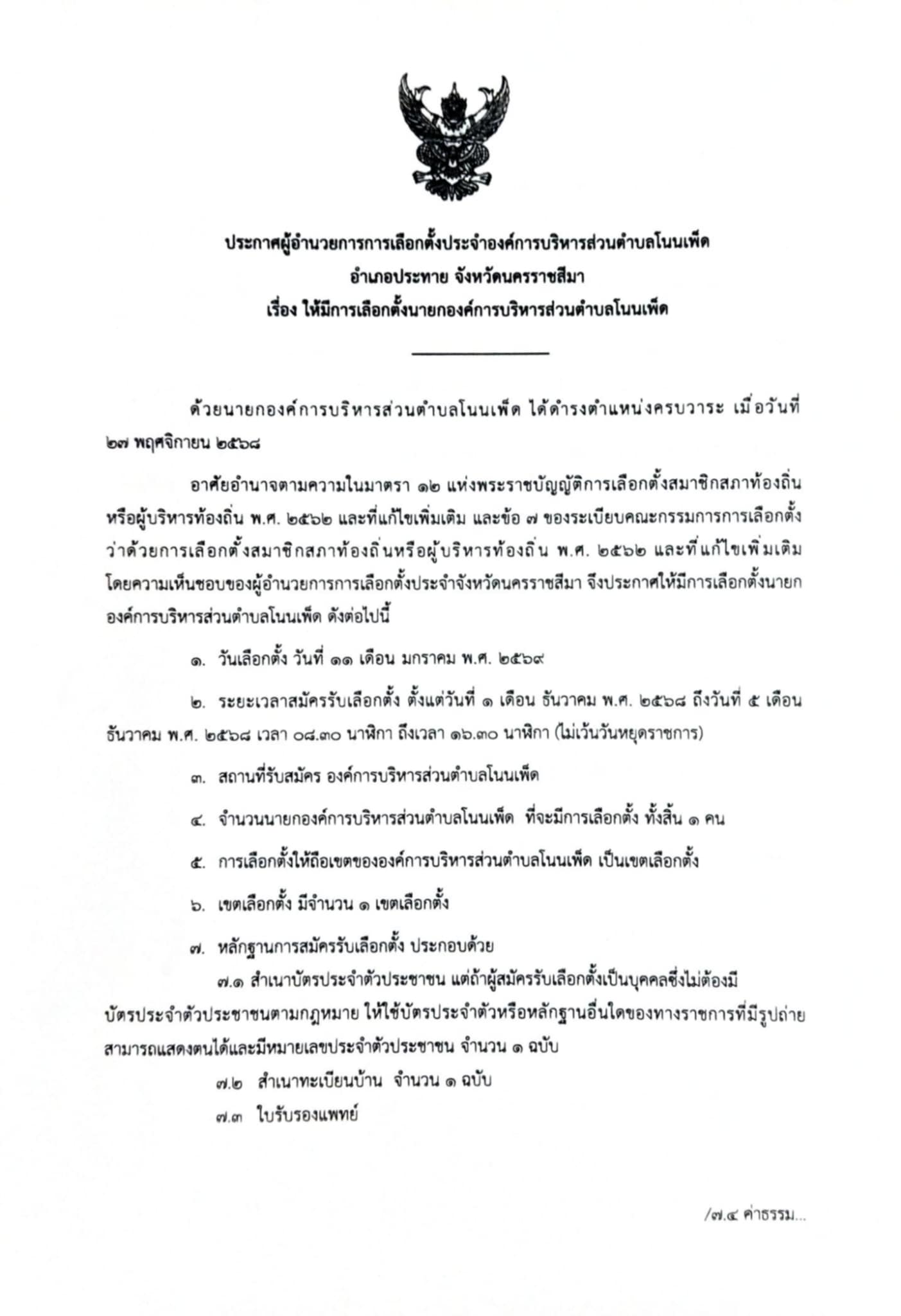 ประกาศผู้อำนวยการเลือกตั้งประจำองค์การบริหารส่วนตำบลโนนเพ็ด เรื่อง ให้มีการเลือกตั้งนายกองค์การบริหารส่วนตำบลโนนเพ็ด